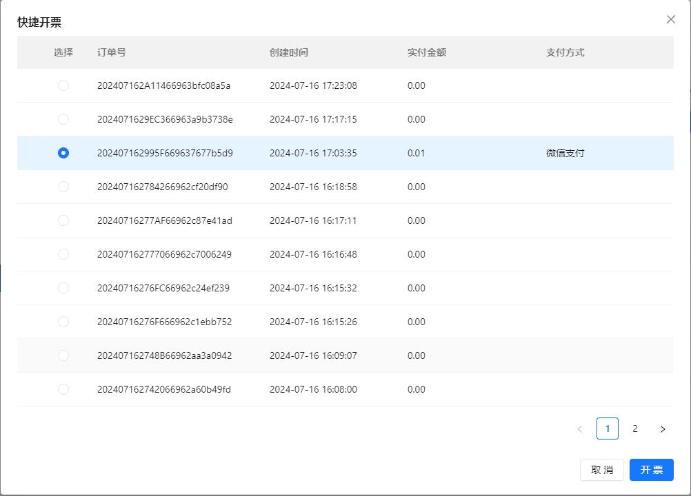 “申请开票”是开票的快捷按钮,点击后展开该账号下所有已支付订单列表,可以选择其中订单进行开票操作